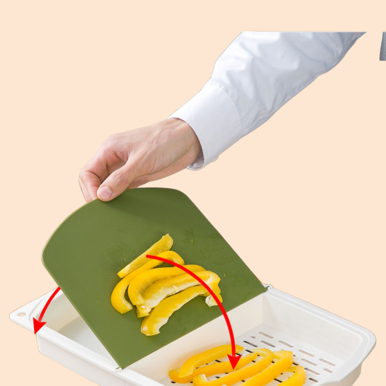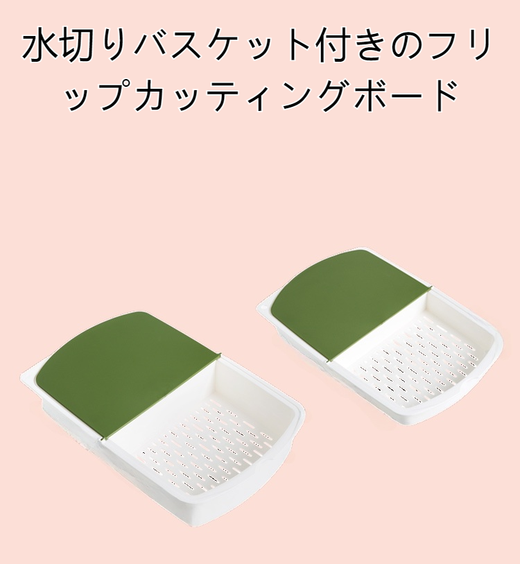 省スペース設計のYH-フリップカッティングボードは、水切りバスケット付きで調理効率アップ。お手入れ簡単、収納便利な多機能キッチン用品。